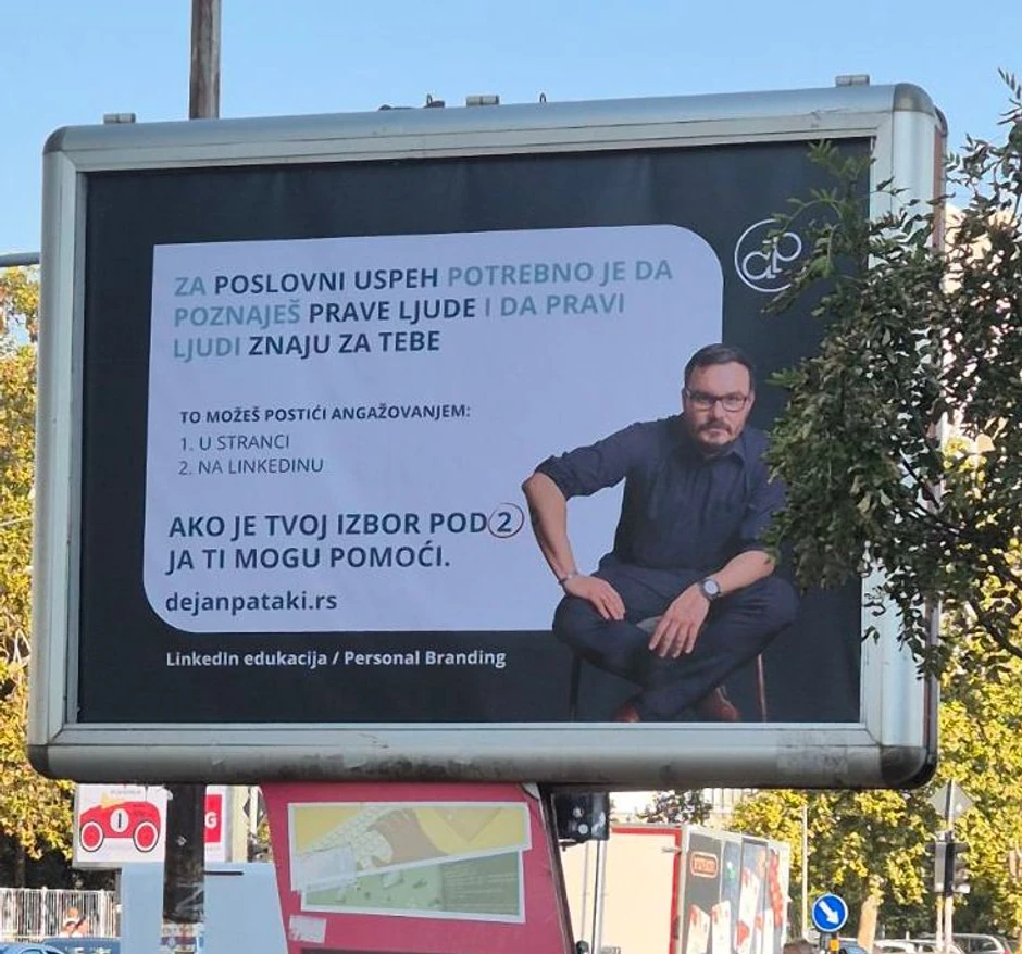Na bilbordu piše: "Za poslovni uspeh potrebno je da poznaješ prave ljude i da pravi ljudi znaju tebe." Dovitljivi Pataki odmah je ponudio i rešenje za one koji nemaju to što je naveo i objasnio da se to može postići angažovanjem u stranci ili na LinkedIn-u.