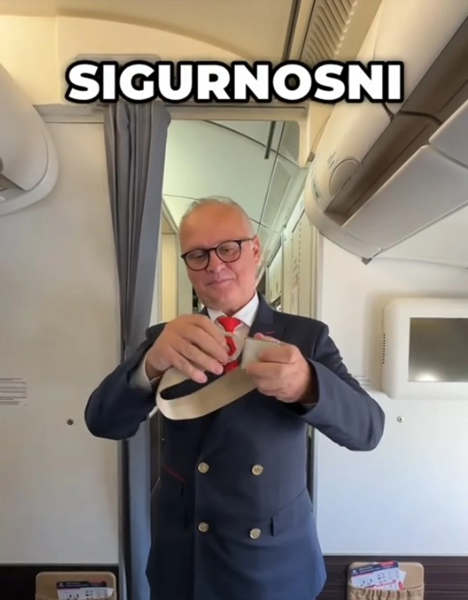 Vesić je u snimku prikazao sigurnosnu proceduru koju prikazuju stjuardese i stjuardi neposredno pre poletanja aviona, a snimak je brzo postao viralan.