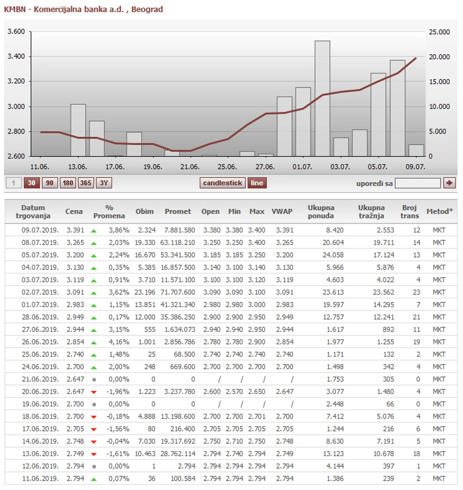 Deonica ove banke svakodnevno je rasla u poslednje dve nedelje, a najveći dnevni skok je iznosio 3,8 odsto. Rast cene pratio je dnevni promet akcijama u iznosu i do 63 miliona dinara. Deonica Komercijalne banke nastavila je da raste i jutros. U prvom satu trgovanja akcija je zabeležila rast od 0,27 odsto.