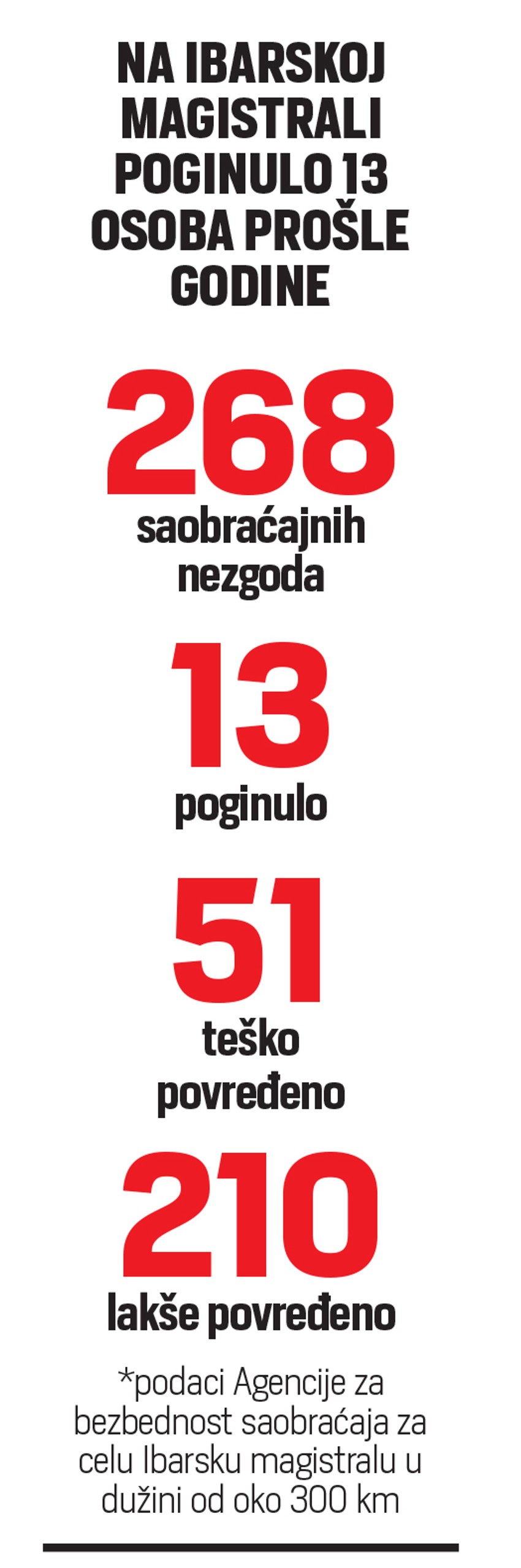 - Prema prvim analizama broj saobraćajnih nezgoda sa poginulima na Ibarskoj magistrali u prethodnih godinu dana smanjen je za 36 odsto dok je broj nezgoda sa povređenima niži za 25 odsto. Dakle, može se reći da je za trećinu smanjen broj poginulih, a za četvrtinu broj povređenih - poručuju u MUP-u za "Blic".