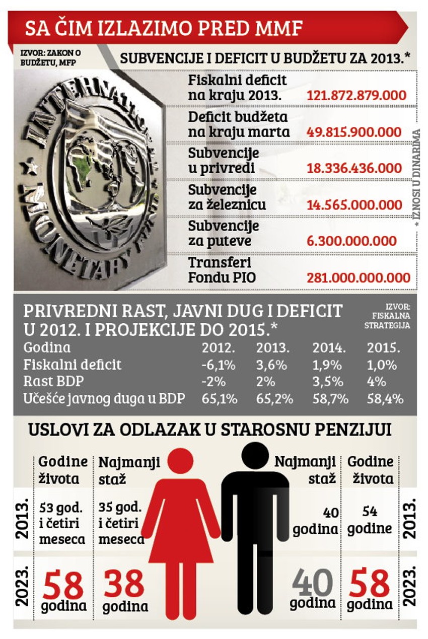Osim toga, srpski pregovarači će morati da uvere misiju MMF-a da će deficit uspeti da održe ispod četiri odsto BDP u ovoj godini i da započnu pripreme za reformu državne administracije, obrazovanja i zdravstva, koja bi uključila i otpuštanje viška zaposlenih.