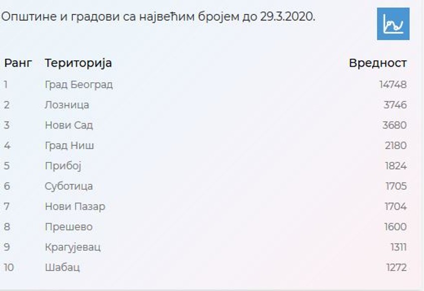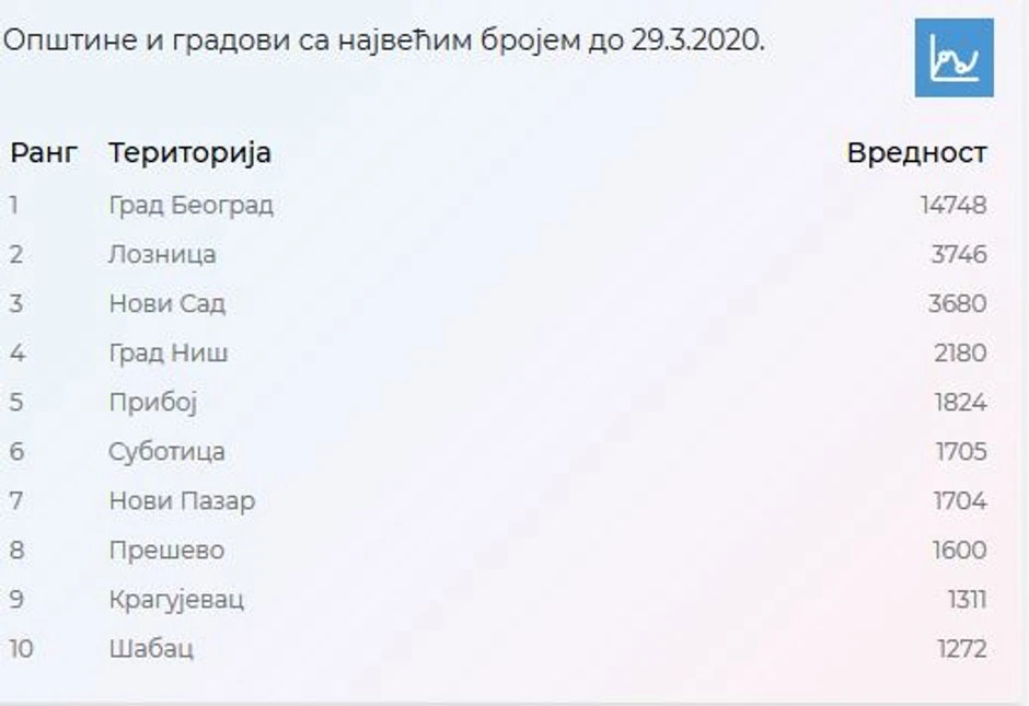 Najmanji broj građana Srbije u samoizolaciji je u Opovu i Trgovištu (po 38 osoba), Gadžinom Hanu (28), a u Crnoj travi je samo jedna osoba u kućnoj izolaciji zbog korona virusa.