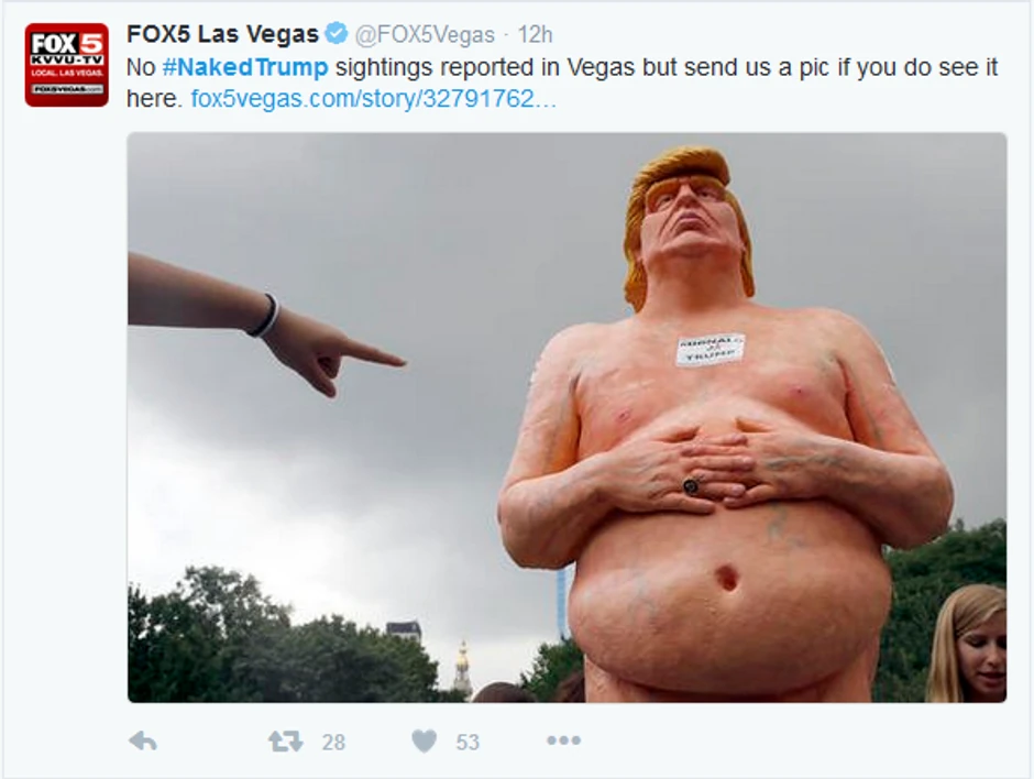 Društvene mreže su preplavljene fotografijama i selfijima sa statuama nagog Donalda Trampa, koje prikazuju republikanskog kandidata za predsednika apsolutno realistično u prirodnoj veličini, a postavljene su u američkim gradovima Njujorku, Los Anđelesu, Sijetlu, San Francisku i Klivlendu.