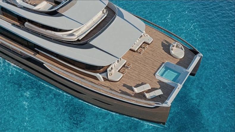 Impresivno plovilo od 60 metara reklamira se kao „najveći i najimpresivniji beach club na vodi“. Model, nazvan Axiom 40, prilagođen je i za privatnu i za čarter upotrebu, a dolazi sa tri infinity bazena sa staklenim ivicama i tri bara. Delo italijanskog dizajnera Maura Giamboija, čak trećina trupa posvećena je prostoru beach cluba. Ukupna površina iznosi 120 kvadratnih metara. Taj prostor objedinjuje preklopne terase, klizna unutrašnja vrata između dvostrukih trupova, kao i VIP kabine sa balkonima koji se direktno otvaraju ka klubu. U ponudi su i bazen sa staklenim dnom i efektnim vodopadom, prema izveštaju Luxury Boat News-a.
