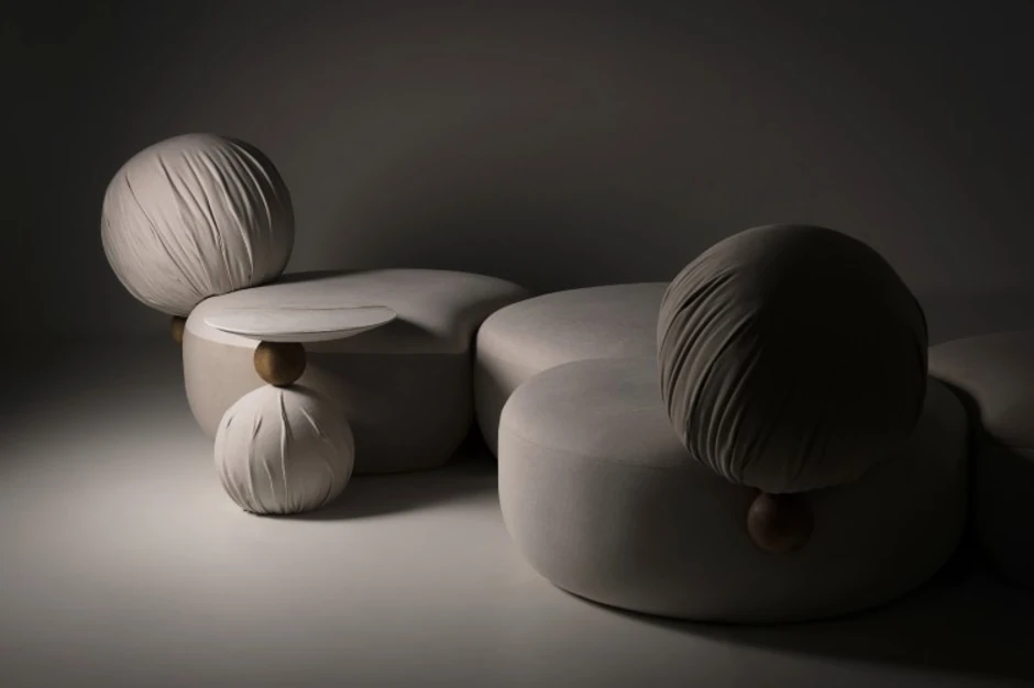 Sofa kombinuje preciznu geometriju i organske oblike: linearna baza sa horizontalnim šavovima donosi strukturu, dok sferni nasloni unose mekoću i dinamiku. Elementi se mogu rotirati i kombinovati, stvarajući prostor koji se prilagođava korisniku, a ne obrnuto. Ovaj dizajn omogućava stalnu igru improvizacije, baš kao i kapoeira.