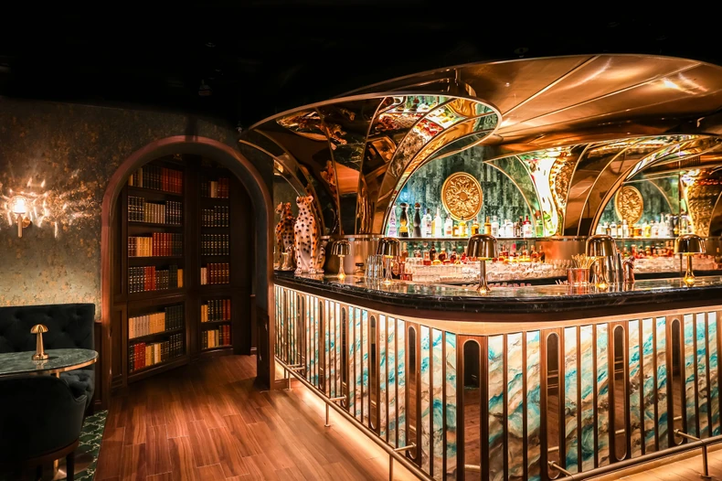 Unutrašnjost bara odiše elegancijom. Na prvi pogled privlače pažnju plišane stolice i stolovi od mermera, dok diskretna rasveta pruža intiman i topao ambijent. Zlatni ukrasi dodaju notu luksuza, a bogate zavese od crvenog baršuna otkrivaju malu scenu spremnu za živu muziku ili večernje performanse. Enterijer poziva goste na beg od stvarnosti, u prostor gde svaki detalj ima svoju svrhu, pa čak i rasveta podseća na svetla reflektora.