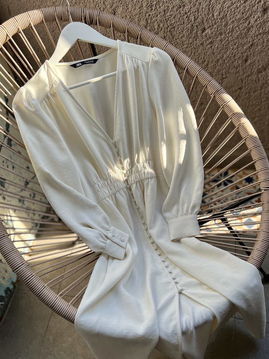 Bela haljina, ležerno prebačena preko moderne stolice od pruća, odiše bezvremenskom ženstvenošću. Njena strukirana silueta i nežni detalji dugmića nagoveštavaju savršen balans elegancije i lakoće, spremna za večernju koktel zabavu ili intimnu prazničnu večeru.