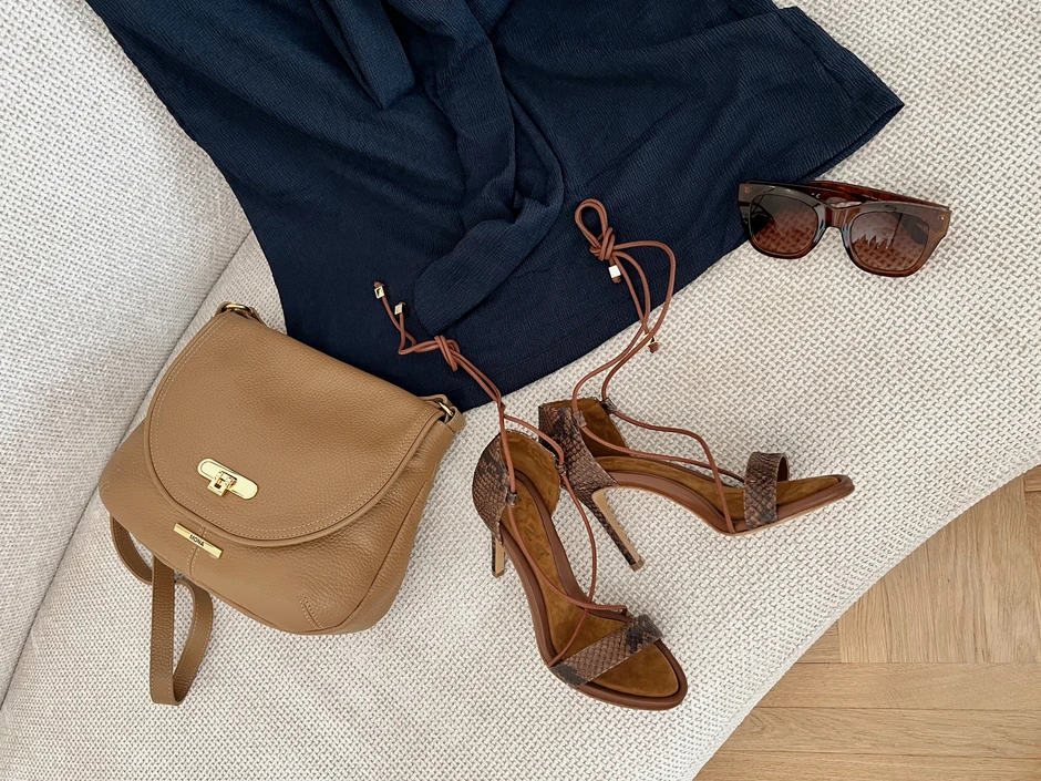 Naravno, njen utisak je onoliko besprekoran koliko i detalji kakve birate uz nju. Zato razmišljajte u pravcu kvaliteta i dugovečnosti: kako stilske, tako i one praktične, koja podrazumeva mnogo godina nošenja sa uživanjem. Ova tašna od puter-meke kože u svetloj nijansi prirodne kože ima formu kakva će retko biti van trendovskih okvira, jer ostavlja utisak "tihog luksuza". Naočare za sunce sa masivnim okvirom od kornjačevine tu su da evociraju retro stil holivudskih diva.