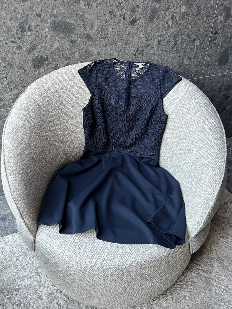 Može li enterijer da nadahne modni stil? Ukoliko je reč o produhovljenom minimalizmu kakav vlada u ovom lounge kutku Grey hotela, jasno je gde se sreću lajtmotiv jesenjih trendova i postulati iskusnog ukusa u dekoru. Ležerno prebačena preko mekih modernističkih linija stolice neutralnih tonova, haljina u tamnoplavoj boji odiše suptilnim šarmom i vanvremenskom otmenošću. Oplemenjena dekolteom od čipke retro geometrijskoj uzorka, ona je u podjednakoj meri decentna i zanosna. Minuciozni detalji na gornjem delu savršeno se nadopunjuje sa glatkom teksturom tkanine, stvarajući nenametljiv, ali uzvišen izgled.