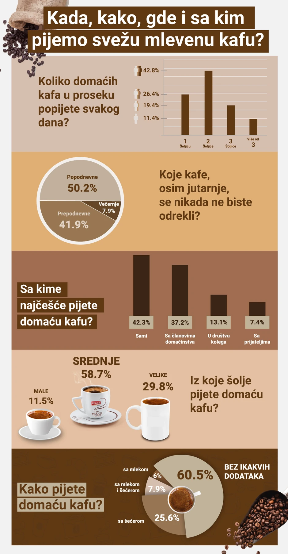 No, najzanimljiviji rezultat ove naše ankete svakako jeste to što ogromna većina ljudi, preko 60 odsto svih ispitanika, toliko voli ukus prave domaće kafe, da je pije bez ikakvih dodataka. A upravo takva kafa je najprirodnija i najzdravija. Tek četvrtina ljudi voli slađu ili potpuno slatku kafu, a samo 13% će kafu razblažiti mlekom.