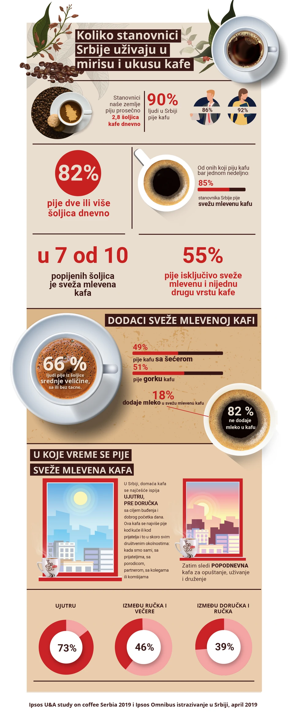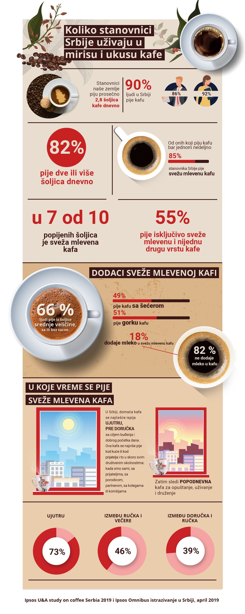 Kako otkrivaju ispitanici, prva jutarnja kafa daje im neophodnu energiju da uspešno započnu s dnevnim aktivnostima, a popodnevna se uglavnom pije na miru sa punim uživanjem u društvu porodice, prijatelja ili kolega. Zanimljivo je i to da se mnogima od nas dan deli na periode između dve sveže mlevene kafe.