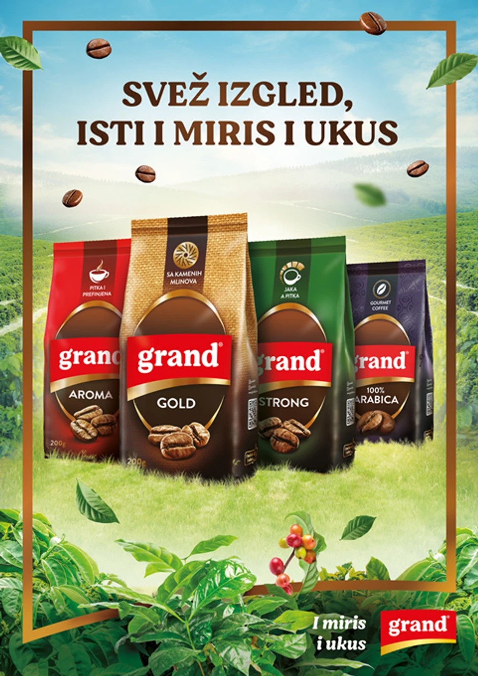 Nova, redizajnirana pakovanja inspirisana svežinom i sama pomisao na nezamenljivi osećaj uživanja u ispijanju omiljene kafe iz Grand asortimana, biće vaš podsetnik da uvek odvojite vreme za sebe i vaše najmilije. Prepoznatljivi i miris i ukus Grand kafe, kombinacija su koja budi najnežnija osećanja i poziva na druženja i razgovore koji se dugo pamte. Zato, hajde da imamo vremena za dragocene trenutke opuštanja, stvaranje uspomena koje život čine bogatijim i onu šoljicu kafe koja ih oplemenjuje i iznova spaja.