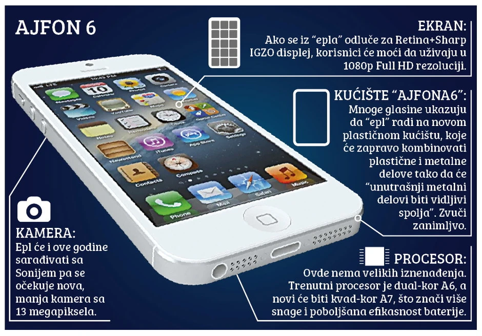 Dva nova modela telefona iz “Epla” stići će do kraja godine i pokušaće da poprave mlak utisak među kupcima koji je ostavio “ajfon 5”. Za početak priča se da će šestica imati kućište od aluminijuma i savršen HD ekran.