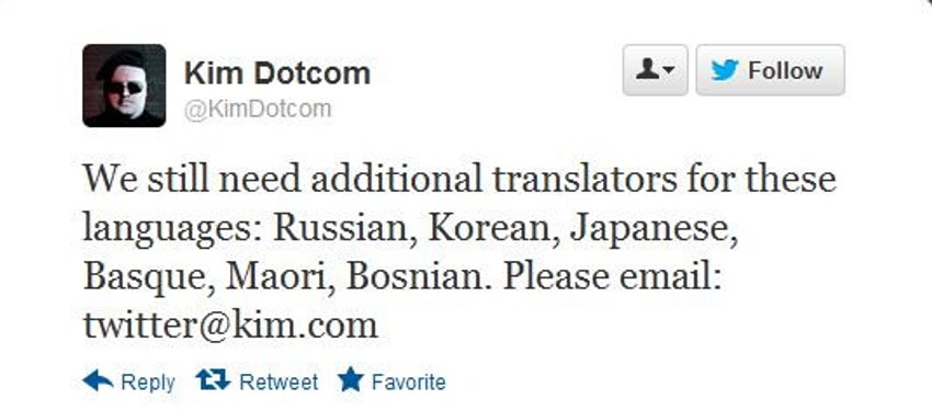 Kim Dotkom, osnivač sajta "Megaaploud", objavio je na svom profilu na Tviteru konkurs za prevodioce na razne svetske jezike, među kojima je i bosanski.
