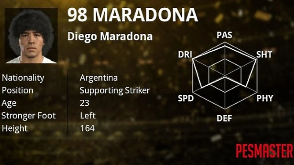 Inače, njegov lik se pojavljuje kada igrate u modu myClub, pa kao jedan od "legendi", uz Garija Linakera, Tjeri Anrija... Argentinac ima ocenu 98, najvišu moguću. Na primer, Ronaldo ima 93 a Ronaldinjo 91. Iz Konamija nisu komentarisali najavu čuvenog fudbalera.