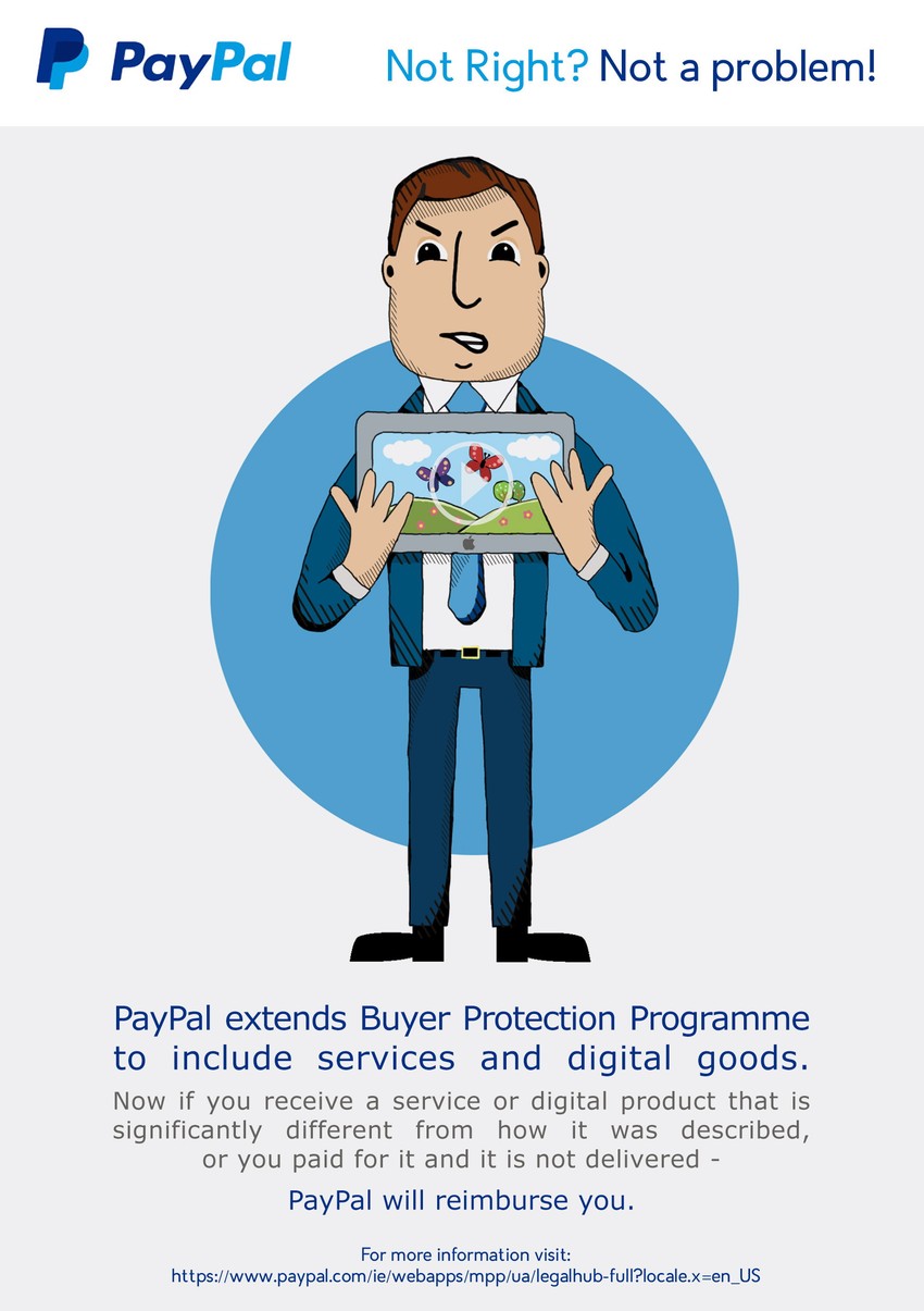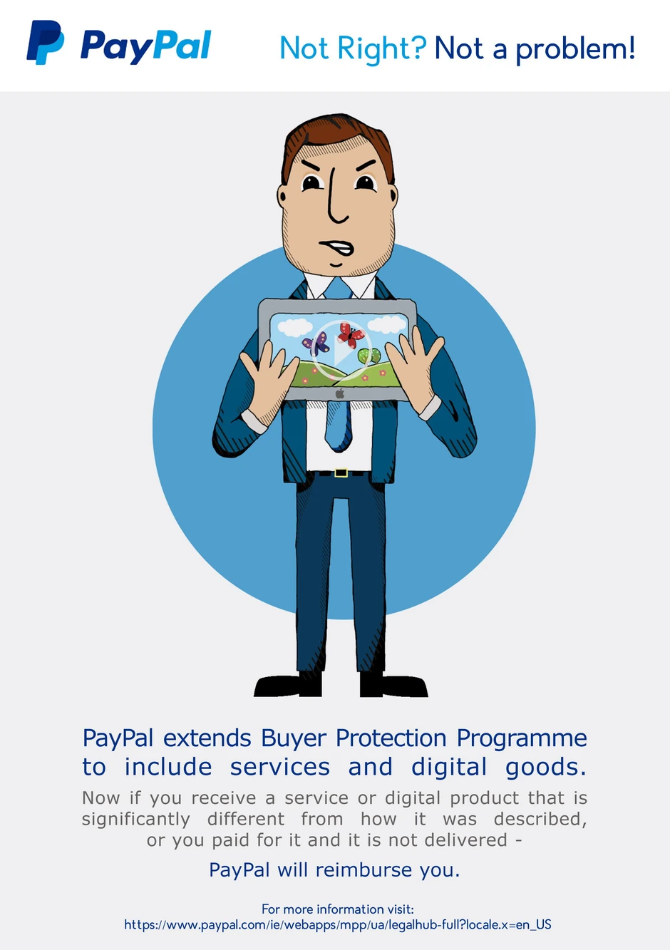 PayPal će nadoknaditi troškove kupcima ukoliko prime uslugu ili digitalni proizvod koji se znatno razlikuje od onoga kako je opisan ili plate za proizvod koji potom ne bude isporučen. Ovim se dodatno proširuje Program zaštite kupaca servisa PayPal koji je krajem prošle godine uvrstio i robu pravljenu po narudžbini i produžio rok za reklamacije kupaca za četiri puta, sa 45 na 180 dana. Novi vid zaštite čini kupce još sigurnijim kada koriste servis PayPal za kupovinu digitalnih proizvoda i usluga.