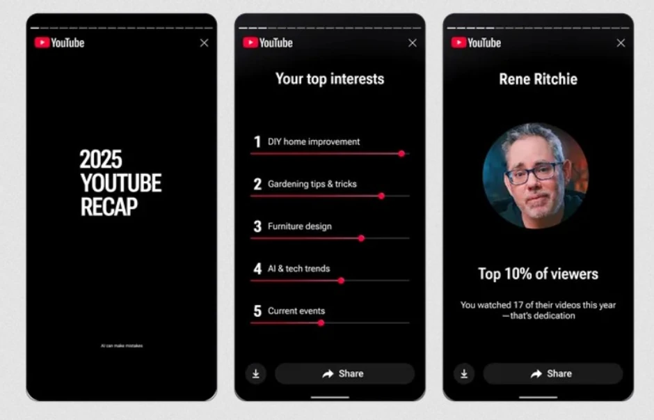 YouTube je najavio da je "Recap" dostupan korisnicima u SAD, dok globalno uvođenje očekuje kasnije ove nedelje. Funkcija prikazuje do 12 kartica koje ističu korisničke najomiljenije kanale, interesovanja i promene u ukusima tokom godine, a takođe dodeljuje "ličnost gledanja" na osnovu istorije pregleda.