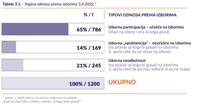 Projekcija je i da će se izlaznost na predstojećim predsedničkim, parlamentarnim i beogradskim izborima kretati između 54 i 57 odsto.