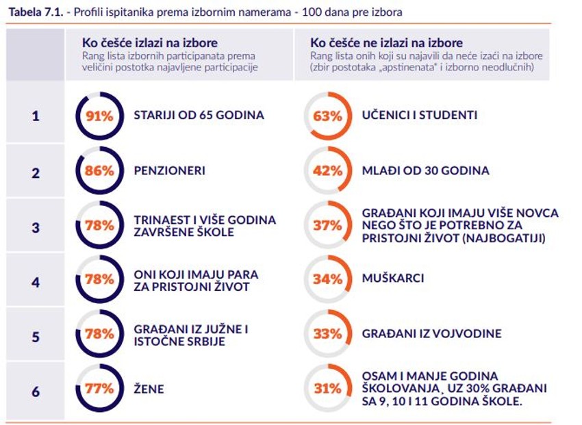 S druge strane, na izbore najčešće izlaze žene starije od 65 godina, penzionerke iz južne i istočne Srbije, ali i one sa 13 i više godina školovanja koje imaju novca za pristojan život.