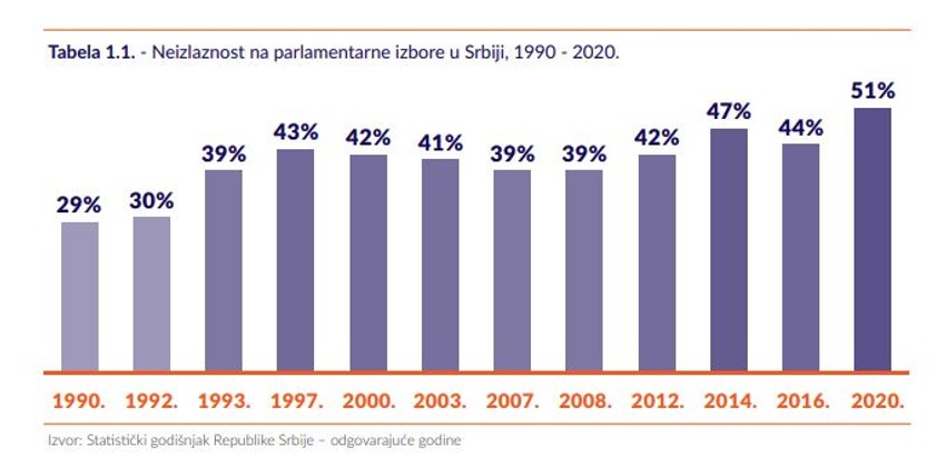 Njih, i ostalih koji se mogu svrtati u grupu apstinenata, u Srbiji će na predstojećim izborima biti od 43 do 46 procenata, pokazalo je istraživanje koje je objavila Nacionalna koalicija za decentralizaciju (NKD).