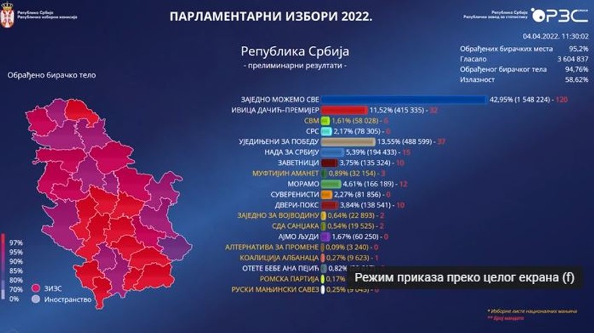 Na osnovu 95,14 odsto biračkih mesta koje je obradila Republička izborna komisija (RIK), trenutno najviše glasova na parlamentarnim izborima - 42,95 odsto, ima koalicija okupljena oko SNS "Žajedno možemo sve", što je oko 120 poslanička mesta.