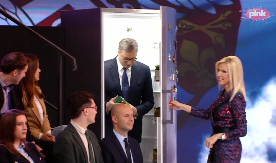 Predsednički kandidat Aleksandar Vučić sa svojim saradnicima gostuje na TV Pink, a u studio je ušao iz - frižidera!