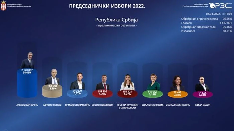 Na osnovu rezultata sa 95,08 odsto biračkih mesta koje je obradila Republička izborna komisija (RIK), trenutno najviše glasova na izborima za predsednika Republike ima kandidat Aleksandar Vučić, sa 58,76 odsto, objavljeno je na sajtu RIK-a.