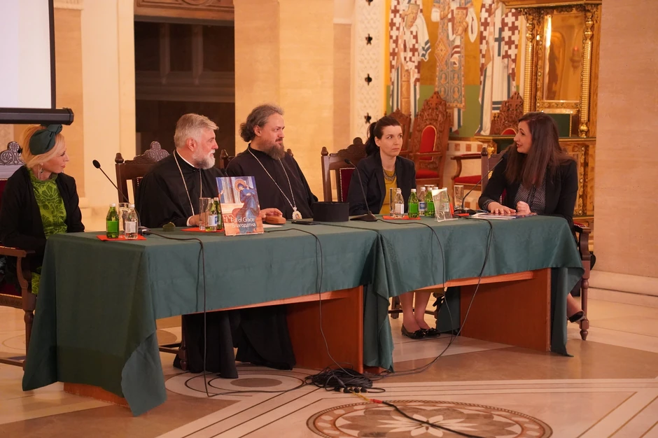 U prepunom prostoru Kripte, o knjizi su govorili episkop diseldorfski Grigorije, episkop zapadnoamerički Maksim, Ivana Lemkul, istoričarka umetnosti, i Dubravka Dragović Šehović, urednica izdanja.