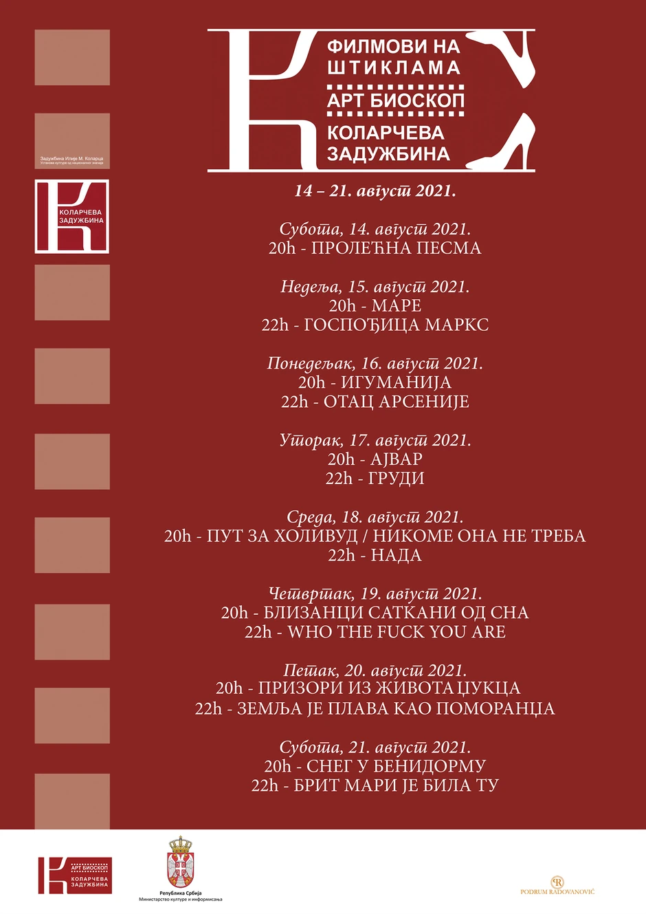 Prvi festival savremenih filmskih rediteljki “Filmovi na štiklama“ biće održan od 14. do 21. avgusta na terasi Kolarčeve zadužbine u organizaciji Art Bioskopa Kolarac, saopšteno je danas iz ove kulturne ustanove.