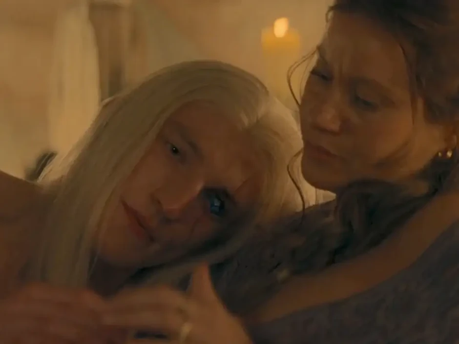 U tom delu poslednje epizode Aemond leži u pozi fetusa i mazi se se prostitutkom koja je ujedno i madam javne kuće, ali i žena sa kojom je izgubio nevinost. U tom trenutku koji više ukazuje na intimu i ranjivost njegovog lika, pojavljuje se kralj (ujedno njegov brat) i počne da ga ismeva. Aemond tada ustaje, pokazujući svoje nago telo, odmah vraća svoju masku i nastavlja da se ponaša kao opasan lik.