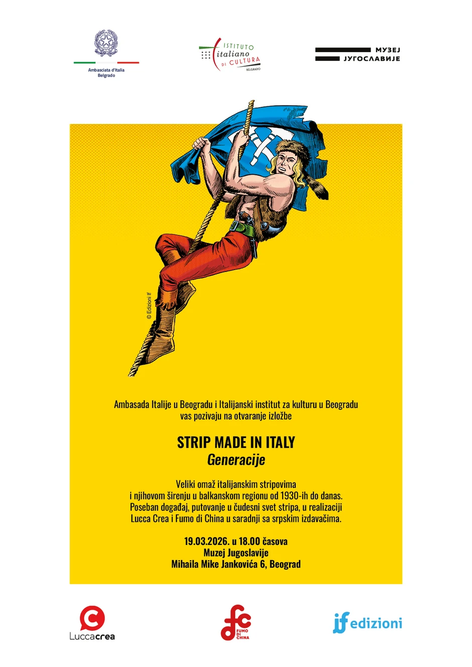 Značajna tematska izložba pod nazivom „Strip made in Italy – Generacije”, biće otvorena u četvrtak, 19. marta u 18 časova u Muzeju Jugoslavije. Posvećena italijanskom stripu, izložba čiji su autori Đani Bono i Đovani Ruso slojevitim pristupom prikazuje i analizira njegov razvoj, uticaj i doprinose ključnih protagonista svih faza, od nastanka do današnjih dana.