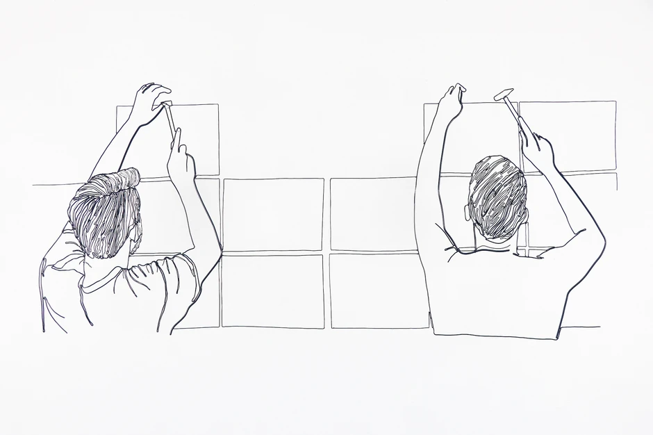 Sledeći svoju višegodišnju praksu žičane materijalizacije crteža u prostoru, Nina Ivanović će se na izložbi u beogradskoj Galeriji RIMA predstaviti radovima inspirisanim, kako i sam naziv govori, procesom postavljanja izložbi, i kolektivnim radom koji taj proces najčešće podrazumeva, a koji je umetnica godinama fotografisala.