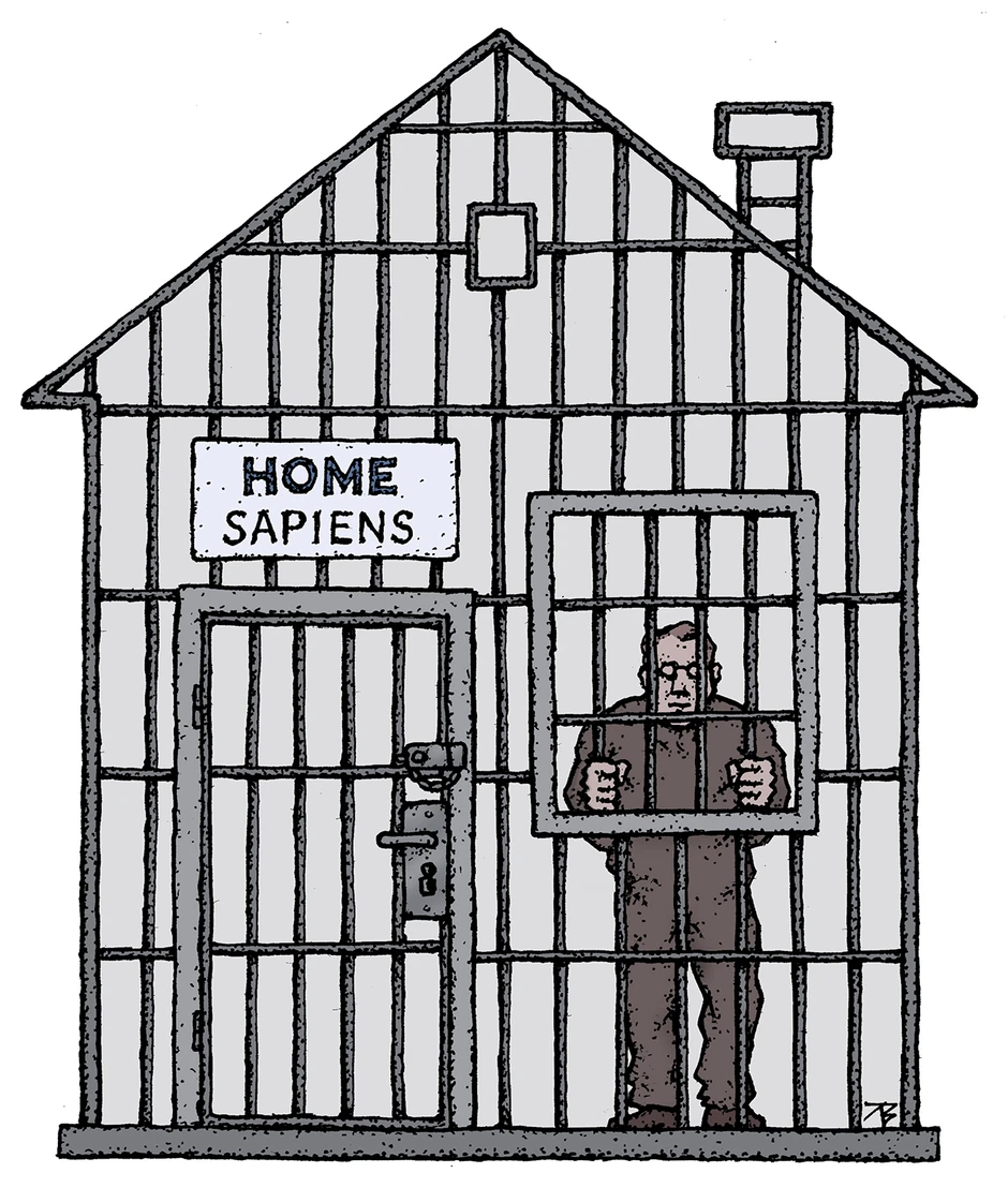 - Stara izreka “smeh je lek” našla je ovde pravu potvrdu. Pored karikatura u štampi, gomila karikatura, foto-dosetki i viceva kruži internetom i na društvenim mrežama olakšavajući ljudima život u ograničenim uslovima na koji ranije nisu postojali. Moju karikaturu “HOME SAPIENS”, jednu od mojih retkih sa rečima, izdavač je izabrao kao reklamnu za knjigu. Primetno je veće prisustvo stranih, šaljivih karikatura sa rečima, za razliku od naših ozbiljnijih i “bez reči”. Radovi su najrazličitijih vizuelnih stilova, od jednostavnih, ali veštih crno-belih crteža do ambicioznih likovno-grafičkih pristupa. Sloboda stvaralaštva u uslovima iznuđene neslobode paradoks je primeren umetnosti karikature. Najzastupljeniji je, prirodno, Zoran Petrović, zatim kubanski Meksikanac Boligan, Italijanka Marilena Nardi, dok sam ja zastupljen sa četiri rada. Tu je i naš Amerikanac Mirko Ilić, dok je čast da bude na naslovnoj strani knjige pripala popularnom kanadskom političkom karikaturisti Brusu Makinonu.