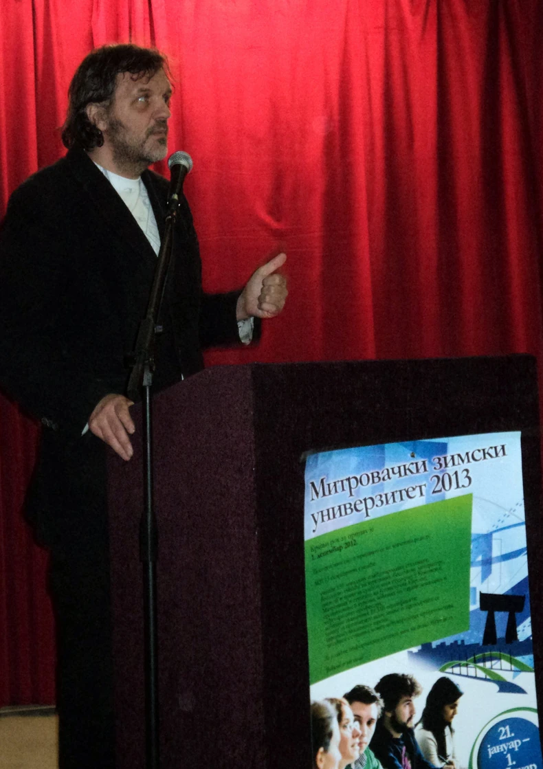 Emir Kusturica je večeras u amfiteatru Fakulteta tehničkih nauka Univerziteta u Prištini u u severnoj Kosovskoj Mitrovici održao predavanje „Realnost i fikcija u filmu“ studentima „Mitrovačkog zimskog univerziteta 2013.“