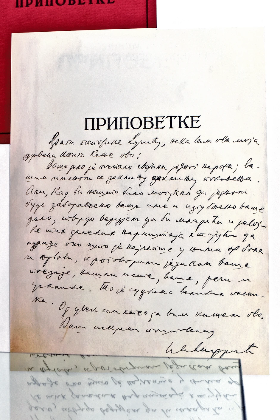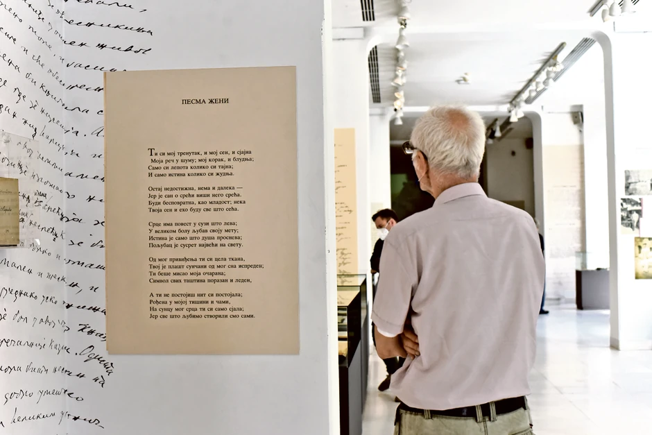 Kao biseri rasute su po izložbi njegove blistave, svevremene pesme ispisane po zidovima. Među njima i "Poezija"... Na svoj način odzvanjaju stihovi: "Mirna kao mramor, hladna kao sena,/ti se bledo tiho devojče što sneva./Pusti pesma drugih neka bude žena,/koja po nečistim ulicama peva.//Ja ne mećem na te đinđuve sa trakom,/nego žute ruže u te kose duge:/Budi odveć lepa da se sviđaš svakom,/odveć gorda da bi živela za druge.//Budi odveć tužna sa sopstvenih jada,/da bi išla ikad da tešiš ko strada,/a čedna, da vodiš gomile što nagle.//I stoj ravnodušna, dok oko tvog tela,/mesto kitnjastog i raskošnog odela,/lebdi samo pramen tajanstvene magle."