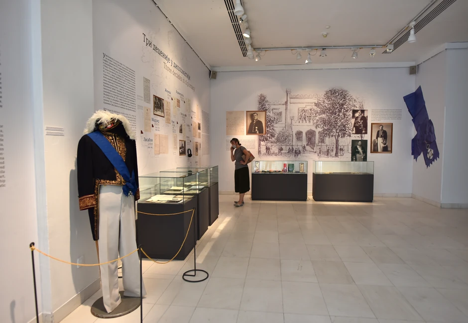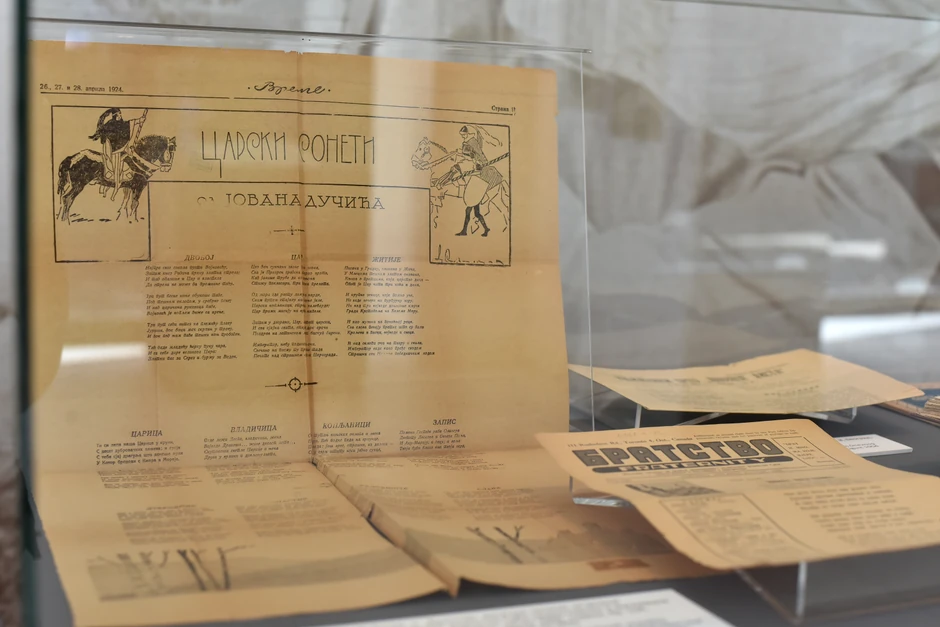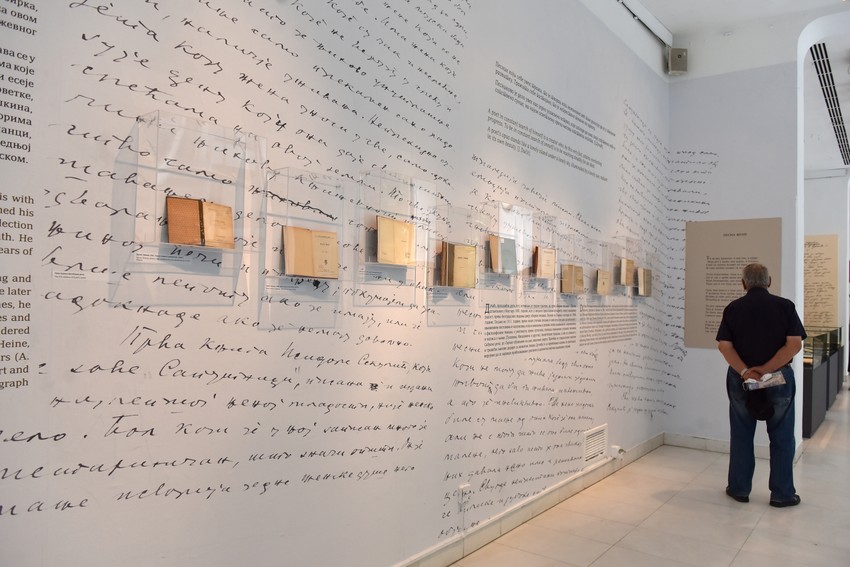 U jednoj od staklenih vitrina "Srbobran", novine u kojima je pisao. Na jednom od zidova, negde u sredini, živopisne razglednice iz 1910, 1925, 1930... sa prizorima Umetničkog paviljona, negdašnjeg hotela Balkan, Kolarčevog imanja na pozorišnom trgu...