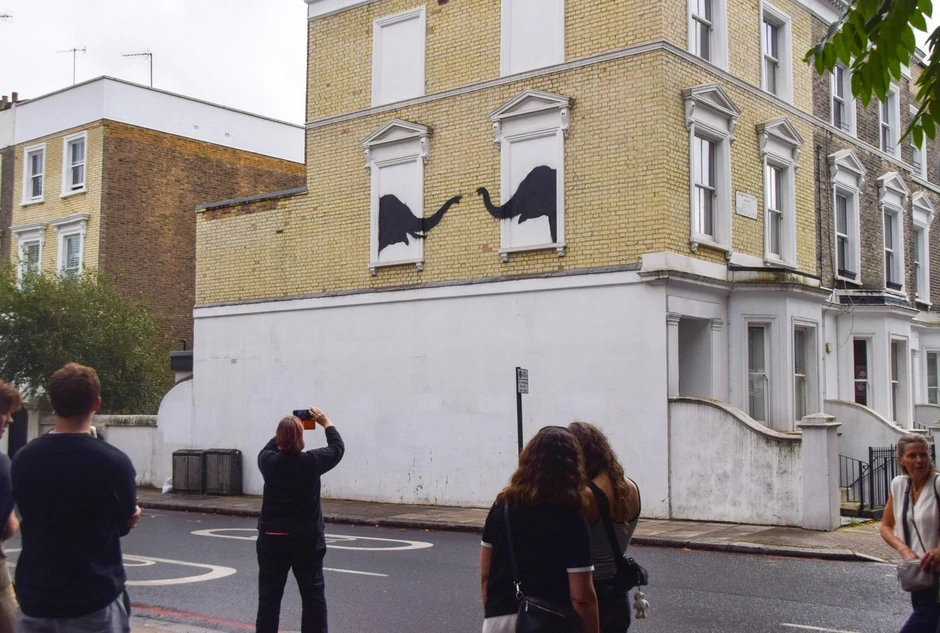 Sinoć su se na dva blokirana prozora pojavila dva slona okrenuta jedan prema drugom. Slika slonova sa strane zgrade u Čelsiju takođe je postavljena na Benksijev Instagram nalog u utorak.