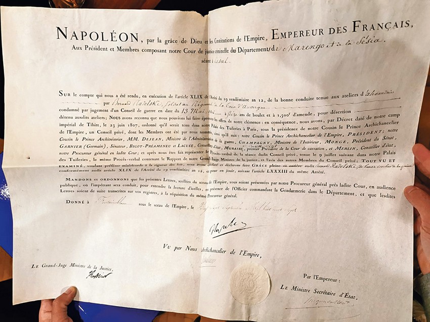 Dokument na pergamentu, neuobičajeno velik za to vreme ratova i kriza, dimenzija 54x42,5cm, potpisan je u Palati Fontenblo u Parizu 27. septembra 1807. Njime se iskazuje milost prema dezerteru Aleksandru Bernaru Radelskom osuđenom 1806. na "šesnaest godina nošenja kugle sa okovima i 1.500 franaka kazne", uz obrazloženje "dajemo prednost milosrđu nad strogosti zakona".