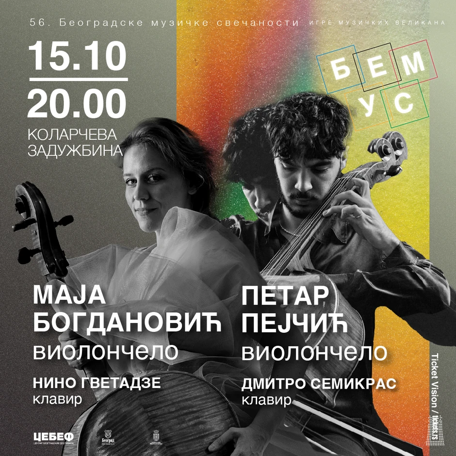 U utorak 15. oktobra od 20h nastupiće virtuozi na violončelu Petar Pejčić i Maja Bogdanović, uz klavirsku pratnju ukrajinskog pijaniste Dmitra Semikrasa i Nino Gvetadze, pijanitskinje iz Gruzije. Ulaznice po ceni od 1.000 do 1.500 dinara mogu se kupiti na prodajnim mestima Ticket Vision-a i preko online servisa tickets.rs.