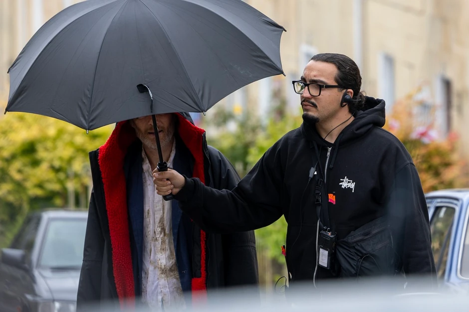 Zvezda "Openhajmera" nosio je crni suvi ogrtač preko kostima dok je prošle nedelje snimao scene za film "Stiv", sa kapuljačom kako ga niko ne bi prepoznao. Asistent produkcije je takođe držao kišobran iznad njega kako bi dodatno zaštitio glumca od radoznalih pogleda, ali i užasnog britanskog vremena.