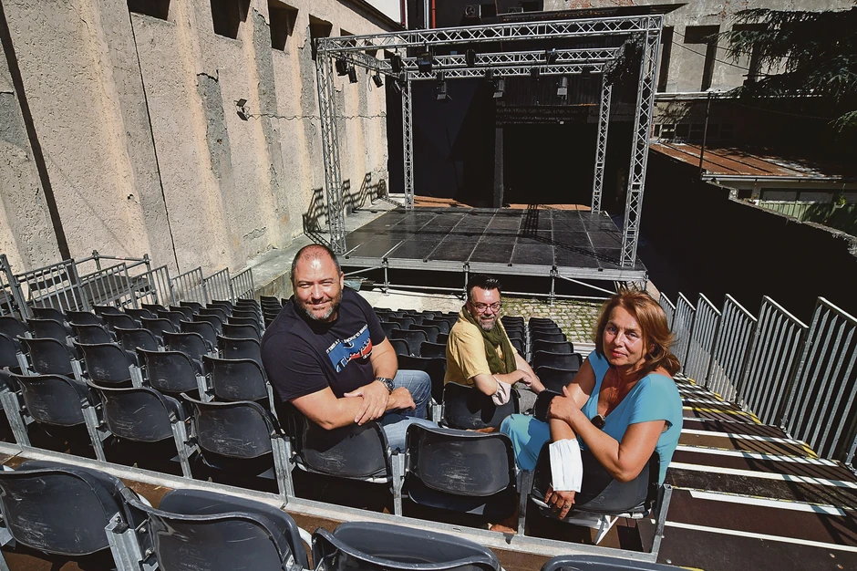 I dok kročimo scenom, a potom i isprobavamo mesta za publiku Jug Radivojević kaže: "Predstava ‘Trpele’ igra se 4. i 5. septembra, zapravo svaka predstava se igra vezano dve ili tri večeri. Onda idu dva, tri dana pauze zbog demontaže, montaže, potpune dezinfekcije. Posle ‘Trpela’, igraće se: ‘Crna kutija’, ‘Moskvičem do pakla’, zatim ‘Sumrak bogova’ sa Brankom Katić kao Sofi 14, 15. i 16. septembra. Slede ‘Fine mrtve djevojke’, ‘Plastelin’ i ‘Kad su cvetale tikve’."