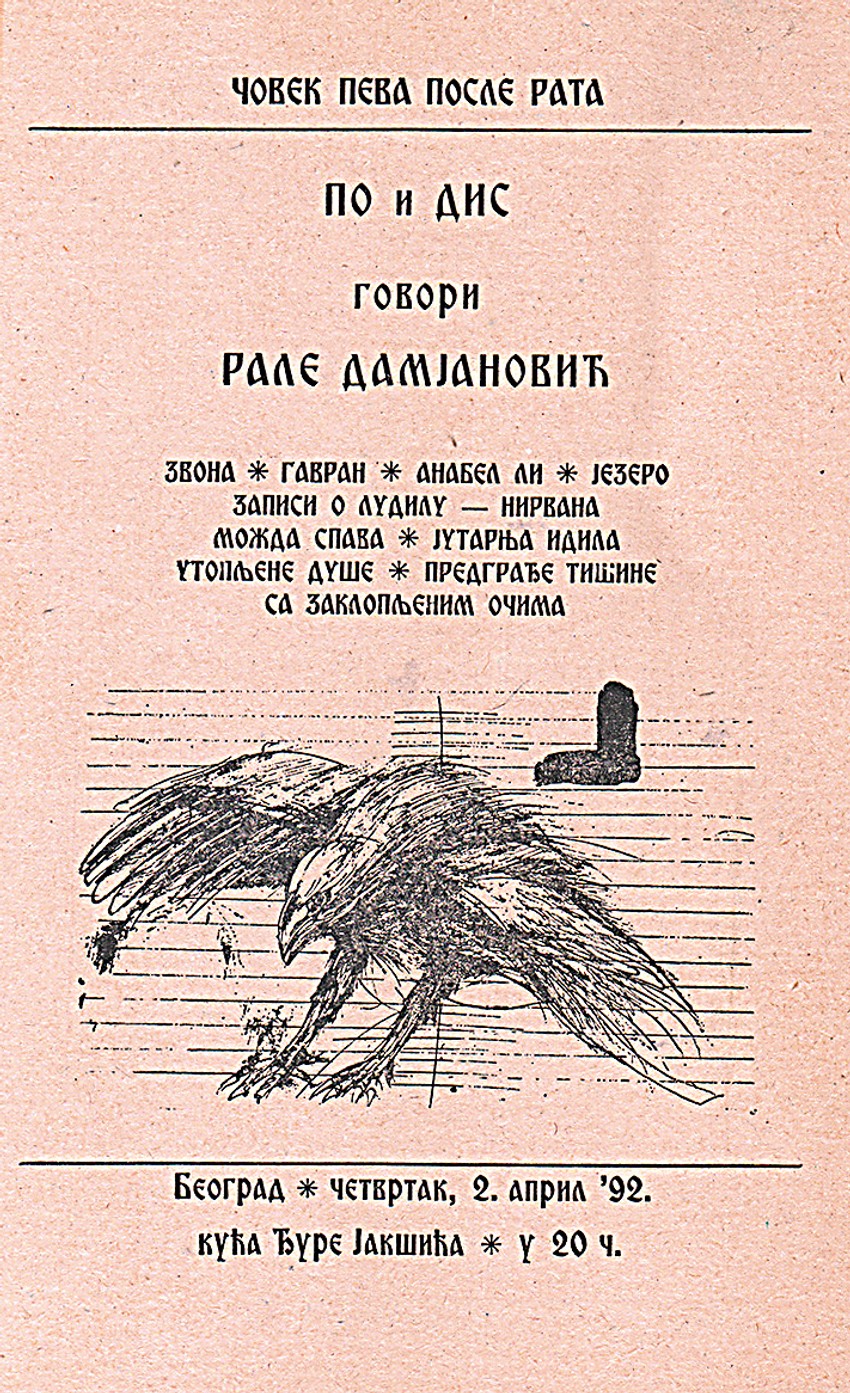 - Igrao sam Edgara Alana Poa u predstavi "Never more" u Teatru poezije. Bilo je to najveće iskušenje za mene, pored recitala koji sam imao u Crkvi Sveti Sava u Njujorku, kada sam govorio naše srednjovekovne pisce. Tek kada je predstava skinuta sa repertoara shvatio sam koliko sam već duboko bio zagazio u neko nezdravo osećanje. Edgar Alan Po se volšebno mešao u sve. Pilo se dosta u toj predstavi. Na ulaznim vratima Teatra poezije stajao je natpis: "Pozorište Gavran", a ulazak publike u salu pratili su tonovi "Santa Maria della Salute" koju je komponovao Enco Lesić, a pevao, onako poovski, Dušan Prelević. To je najbolja inerpretacija Kostićeve pesme. Pri kraju predstave se početna strofa "Santa Maria" pretapala u "Gavrana" a u nekoliko navrata se tokom kazivanja, kao lajtmotiv, probijao kroz tekst poneki stih iz "Santa Marije". Potpuni delirijum tremens. U dnu "posvete gledaocima" stajalo je: "Pacovima u ovoj posveti nema mesta". Teatar je ugašen 1992. godine. U međuvremenu pacovi su se namnožili, i u potpalublju i na palubi.