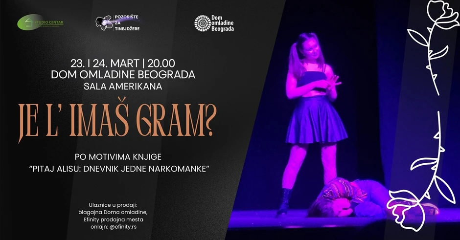 U okviru programa edukativnih pozorišnih predstava za tinejdžere, koji organizuju Dom omladine Beograda i Studio Centar, 23. i 24. marta od 20 časova u sali Amerikana DOB publiku očekuju izvođenja predstave „Je l’ imaš gram?“, nastale po motivima knjige „Pitaj Alisu: dnevnik jedne narkomanke“ .
