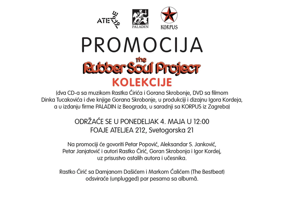 Promocija "Rubber Soul Project" kolekcije, konceptulanog muldimedijskog projekta koji se sastoji od rok muzike, knjiga, dugometražnog filma, animiranih i uživo snimljenih spotova i grafičkog dizajna zasnovanih na kreativnoj "rekonstrukciji" neobjavljenih pesama Bitlsa, održaće se u ponedeljak, 4. maja(12h) u foajeu Ateljea 212, u Beogradu.