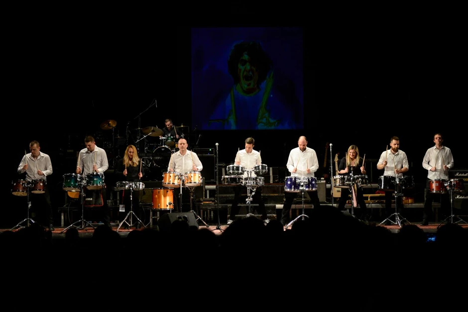 "Balkanska lavina" od desetak bubnjara je prva efektno nastupila dok se simultano na video projekciji odvijala animacija koja se lagano pretvarala u portret Dragoljuba.