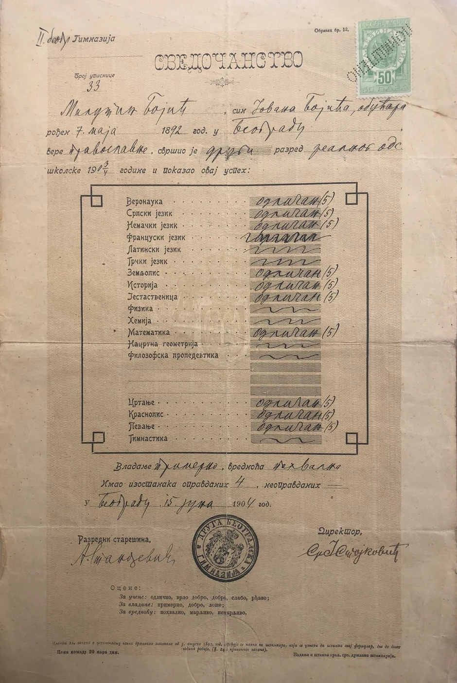 Tu je i originalno Bojićevo svedočanstvo za drugi razred Druge beogradske gimnazije iz 1904. godine. Slavni pesnik je bio izvrstan đak, sa svim peticama i „vladanjem primernim, vrednoćom pohvalnom“.