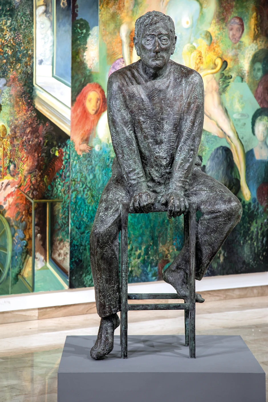 Pisac teksta nam ukazuje da je: „Ljuba uspevao da se približi sreći samo u trenucima samozaborava. Kad bi u radu na slici istrajao do udovoljenja svim njenim prohtevima, tada bi zaboravljao da je on taj koji upravo slika iako je držao četke u rukama. Za ovim blaženstvom, sledio je trenutak od kog je slika svakim dodatnim potezom počinjala da slabi. To je značilo da ga je nadjačala i prevazišla. Tu se zaustavljao. Vajarka je Ljubu zaustavila upravo u tom položaju – nadvladanog slikom. Prikazala je trenutak, kada je seo i zagledao se u svoje dovršeno delo. Kroz nevidljivu borbu u ateljeu, uspeo je da presadi energiju u slike i tako ostane i danas prisutan. Portretna skulptura Sare Nikolić je otelovljenje umetnikovog trajnog postojanja, koje se zahvaljujući Modernoj galeriji Valjevo intenzivno oseća u gradu Ljube Popovića.”