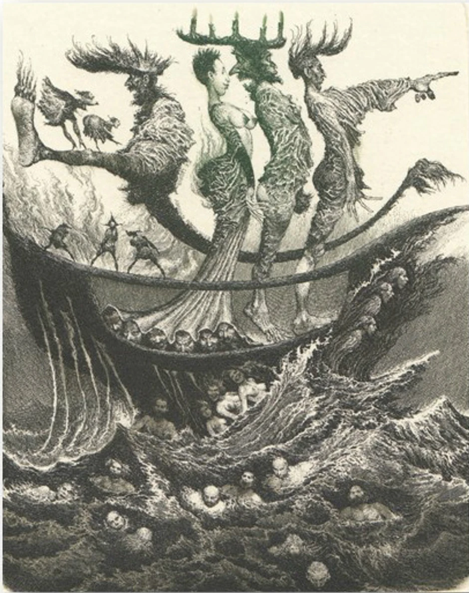 Kako stoji u saopštenju Grafičkog kolektiva, deo ove bogate ikonografije moguće je u prvom sloju tumačiti i prepoznati kao snove, apokaliptične vizije bahanalija, izmaštane gradove, mora i brodove, lađe pretovarene čudacima, čoveka i ženu - glavne aktere ove izmišljene sreće, vavilonskih i ostalih kula. Njegov prepoznatljiv ikonografski repertoar karakteriše minucioznost u detaljima i perfekcija grafičke veštine; poput renesansnih majstora gravera u radu na bakarnoj matrici koristio je i lupu.