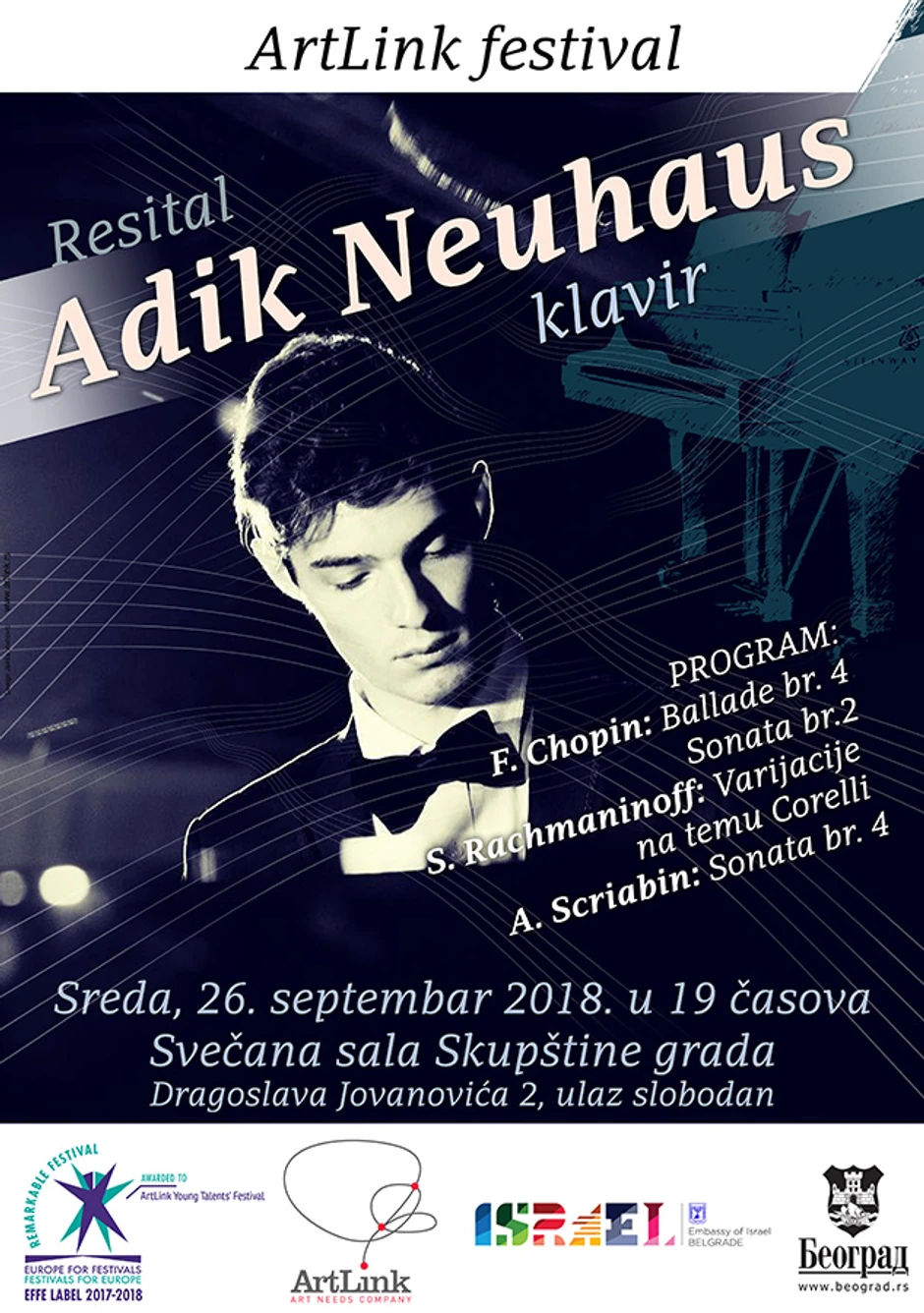 Mladi pijanista Adik Nojhauz, pripadnik četvrte generacije čuvene pijanističke porodice Nojhauz, gost je petog ArtLink festivala mladih talenata. On će se predstaviti resitalom u Svečanoj sali Skupštine grada Beograda, večeras u 19 časova, saopštili su organizatori Na programu će biti izvedene kompozicije Skrjabina, Šopena i Rahmanjinova. Ulaz slobodan. Realizaciju koncerta podržali su Ambasada Izraela i Grad Beograd.