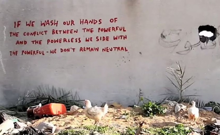 Kamera se u jednom trenutku fokusira na mural mačeta koji je izgleda naslikao Benksi i jednog čoveka, koji kaže na arapskom da je bar mačka našla nešto s čim može da se igra jer deca u Gazi nemaju ništa.